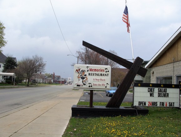 Di ritorno verso sud, il giorno del mio compleanno per pranzo facemmo sosta a Marinette, in Wisconsin. Scegliemmo un ristorante sulla Main Street che già da fuori sembrava promettere bene; si chiamava Memories, credo fosse una scelta obbligata, non c’era molto altro. L’interno si rivelò ancor meglio di quello che ci aspettavamo; l’arredamento fermo agli anni ’50: i tavoli in formica, le pareti decorate con foto di Marilyn Monroe, Elvis Presley, James Dean e Marlon Brando e la musica anni ’50/60 perfetta per l’ambiente ed anche per spezzare un po’ il ritmo incalzante della Fungus 53. Mi aspettavo che da un momento all’altro sarebbero magicamente apparsi Arthur Fonzarelli accanto ad un juke box e poi Richie Cunningham con tutta la banda di Happy Days!