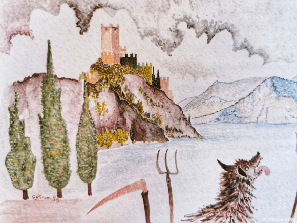 Tanto tempo fa vi fu un inverno freddissimo, con molta neve sulla montagne. I lupi non riuscivano più a procurarsi da mangiare e una brutta notte scesero verso il paese di Malcesine. Entrarono nelle stalle e cominciarono a far razzia, sgozzando vitelli e riempiendosi la pancia di galline e conigli. Un lupo, più maldestro degli altri, o forse più affamato, fece parecchio rumore, tanto da svegliare i contadini. Costoro, infilatisi i pantaloni, scesero a vedere cosa stesse accadendo. Accortisi del lupo, si armarono di forche e roncole e lo inseguirono, decisi a fargliela pagare cara. L’animale cominciò a correre per le vie del paese e ad un certo punto si infilò in una viuzza che si trovava nei pressi del Castello. Questa stradine era così stretta e la pancia del lupo così gonfia che l’animale non riusciva ad andare nè avanti nè indietro e rimase strozzato. Da allora questa via viene chiamata Pica lòf (strozza lupo) e si dice sia la più stretta del mondo.”informatrice: Lombardi Angeluccia