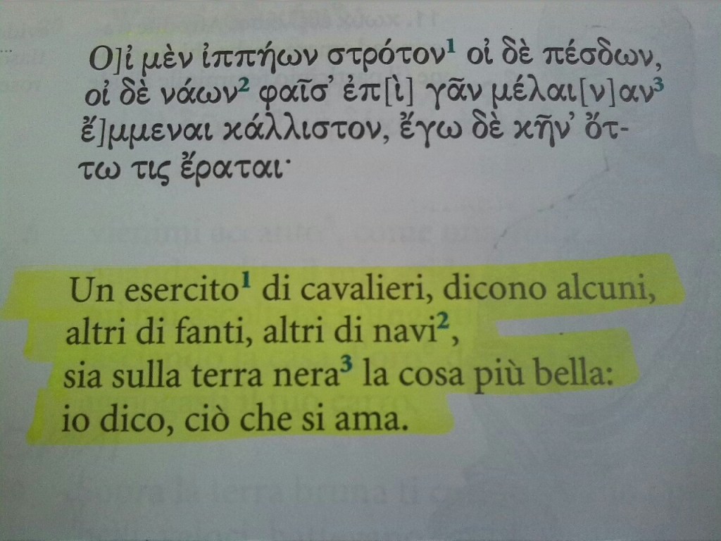 E come Elena, anche per Saffo le guerre e “tutti i carri dei Lidi e chi combatte in armi” non sono nulla di fronte al “passo seducente” e al “volto raggiante e luminoso” dell’amata, e ormai lontana, discepola Anattoria…