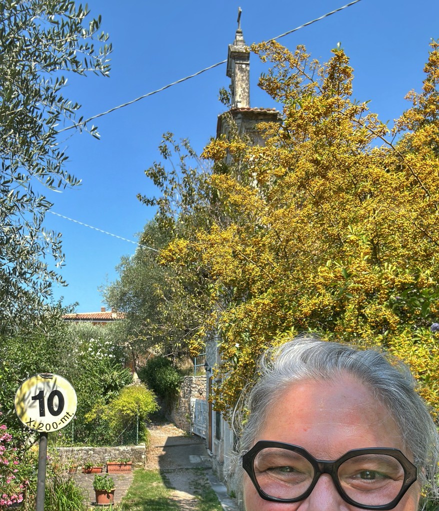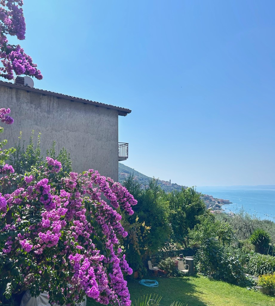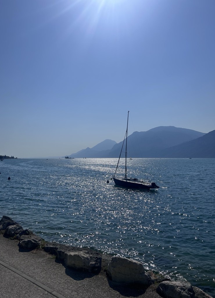 Da lì cammino verso Boccino e poi Ca’ Romana. Una piccola chiesetta – di cui non ricordo il nome, ma sono sicura che un tempo fosse un punto di riferimento fondamentale – riposa tra gli olivi. Asinelli brucano con calma olimpica, come se avessero tutto il tempo del mondo. Le farfalle svolazzano leggere, le cicale riempiono l’aria, e io mi sento come una protagonista di un documentario di National Geographic, ma con un caldo torrido e senza il teletrasporto. Dall’alto, il lago è un foglio azzurro punteggiato da barche a vela: così perfette che sembrano disegnate.