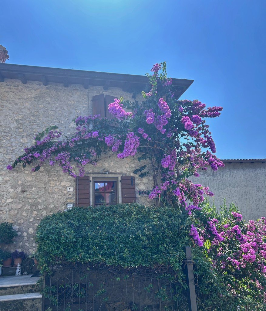 Da lì salgo verso Sommavilla. I capitelli lungo la strada, con i loro santi, madonne e fiori colorati raccontano di devozioni antiche, mentre una bougainvillea fucsia si arrampica su una casa in pietra come una rockstar sul palco. Un tempo qui c’erano un paio di bar e un emporio che vendeva di tutto: oggi porte spalancate e un silenzio che sembra avvolgere ogni cosa. Un silenzio così profondo che quasi mi viene il dubbio di essere finita in un mondo parallelo, senza frenesia: MERAVIGLIOSO!