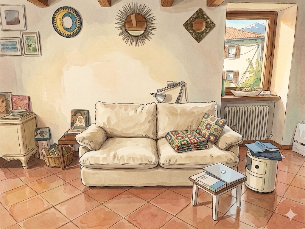 Qui, ho costruito un puzzle di storie. La mia cucina è fatta con mobili da ufficio, il tavolino bianco e verde l’ho letteralmente strappato alla discarica. In sala c’è un vecchio mobile senza ante costruito dal nonno del mio ex marito, accanto alla credenza in legno della mamma di Giulia (che ormai è partita per l’altrove).